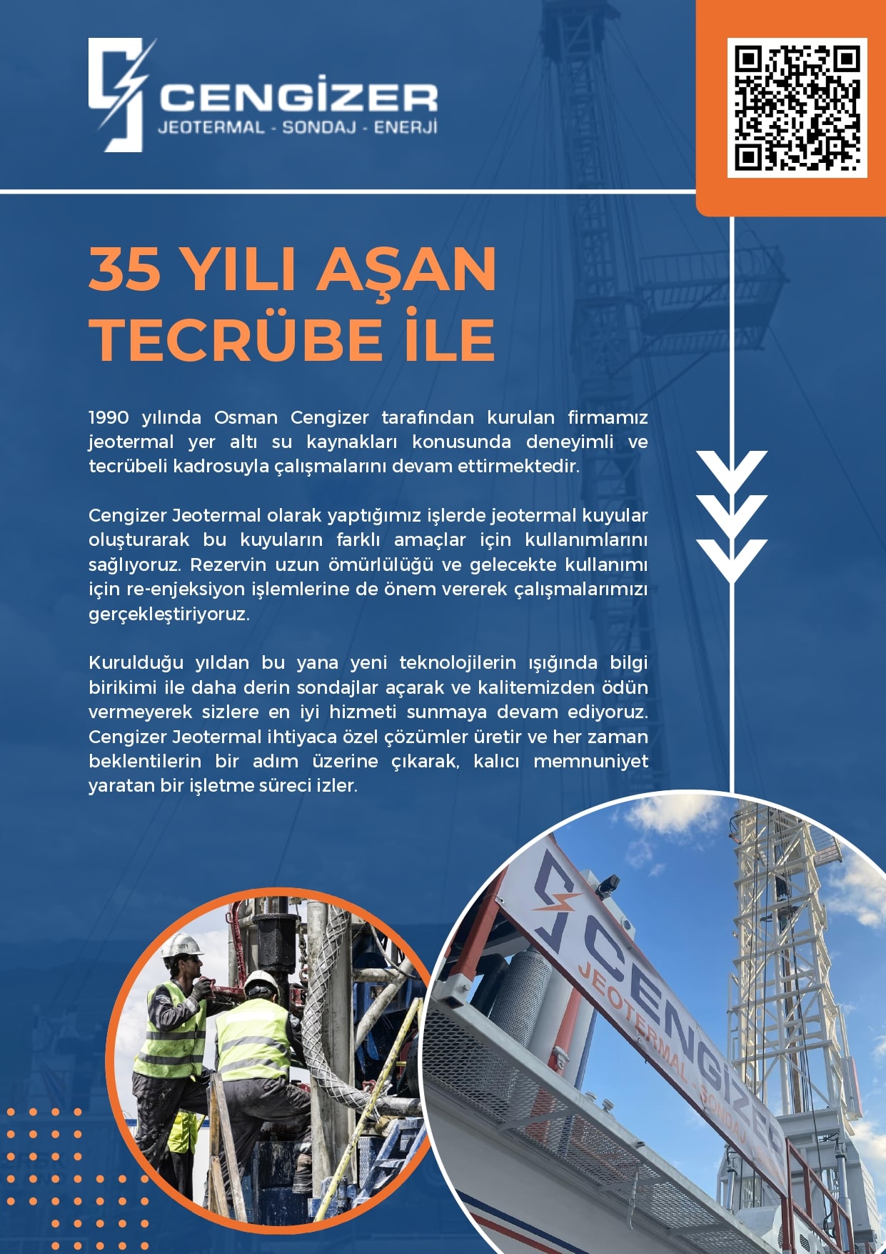 1990 yılında Osman Cengizer tarafından kurulan firmamız jeotermal yer altı su kaynakları konusunda deneyimli ve tecrübeli kadrosuyla çalışmalarını devam ettirmektedir.